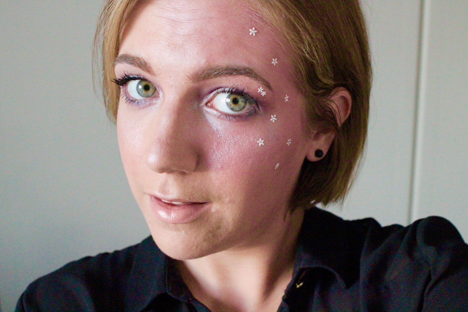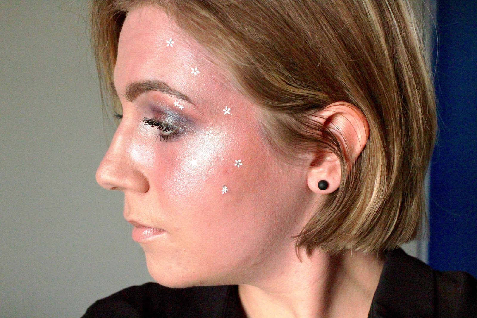 For a bit of extra definition I took my Mac Blue Brown pigment and put it on the outer corner of my left eye, where the intense make up is going on. After putting on some mascara, I searched for some decoration. The only thing I could find were some star-shaped nail stickers, but anything you have laying around will do: some gems, beads, stars... If you have some lash glue, you can use that to stick them down.