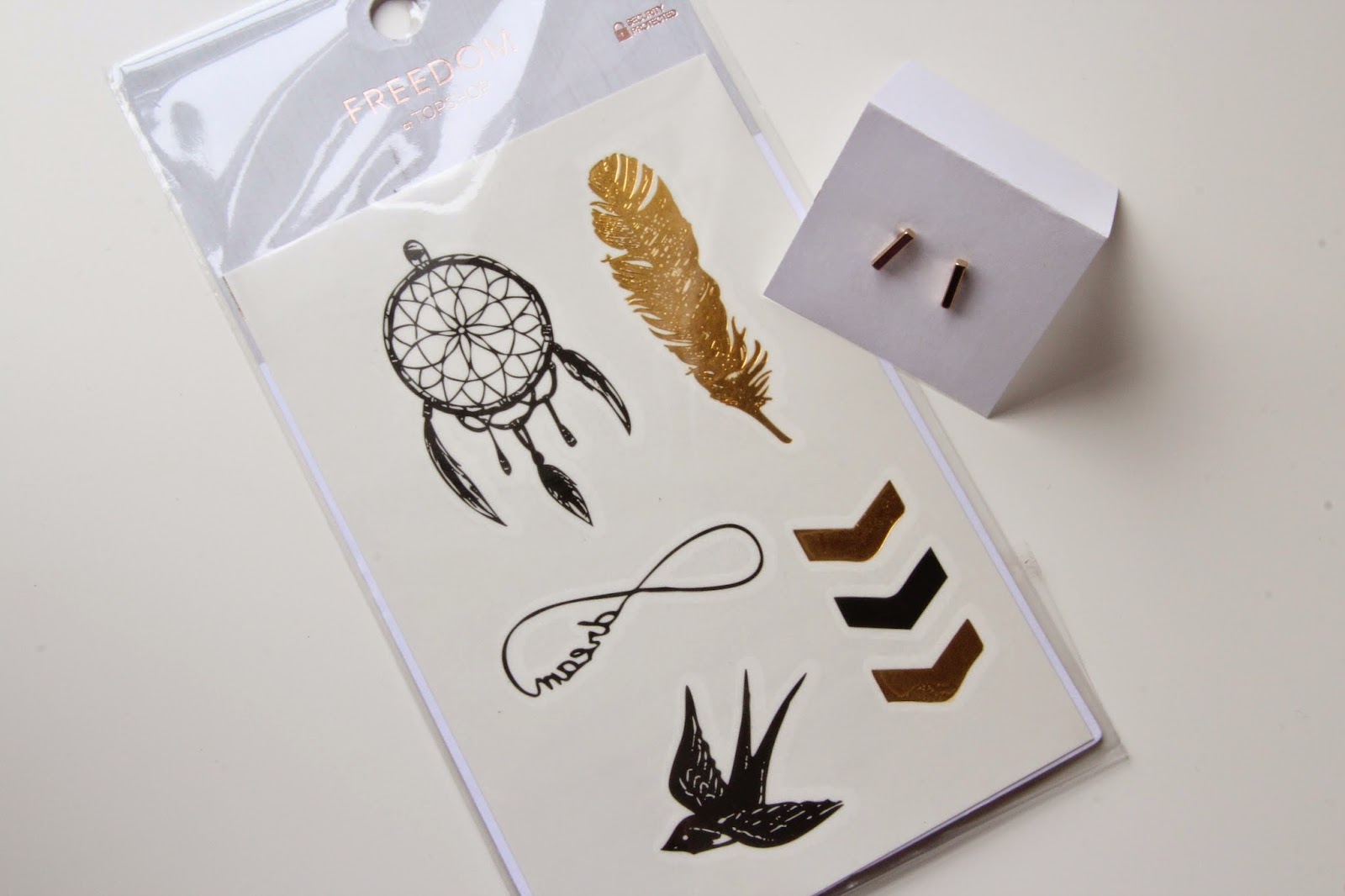 I went to Topshop and bought 2 little jewelries there: these gold minimalistic earrings and some black and gold sticky tattoos for summer (hello? Can I dream about summer yet, please?)